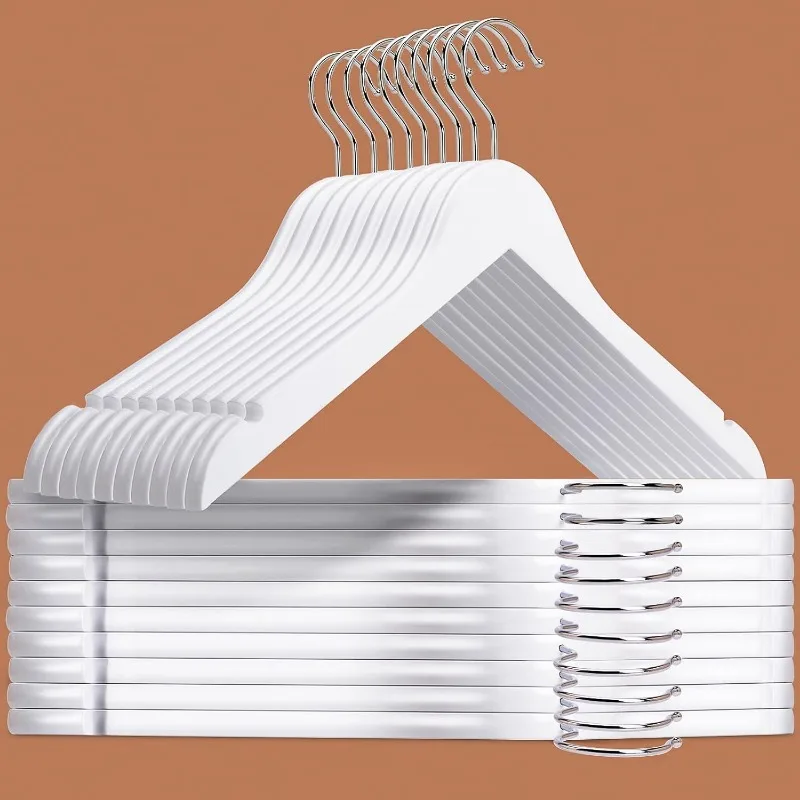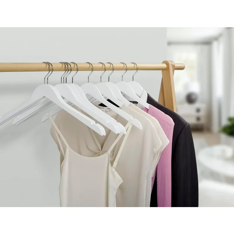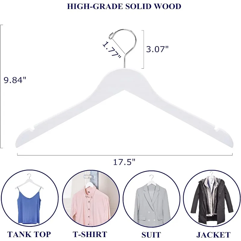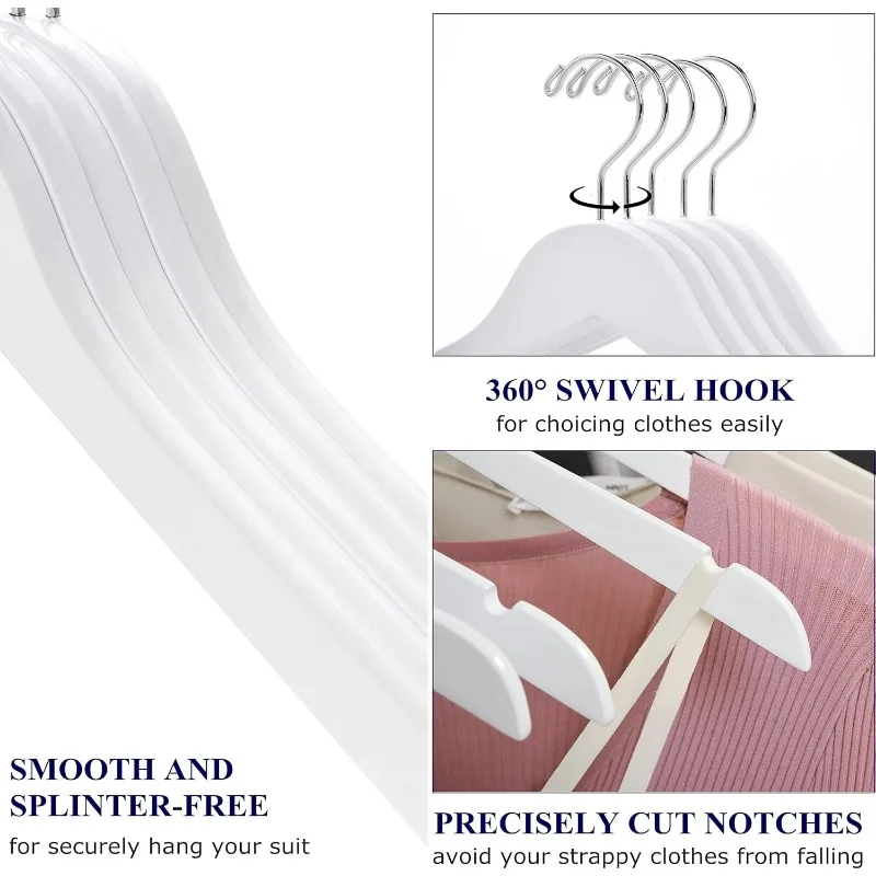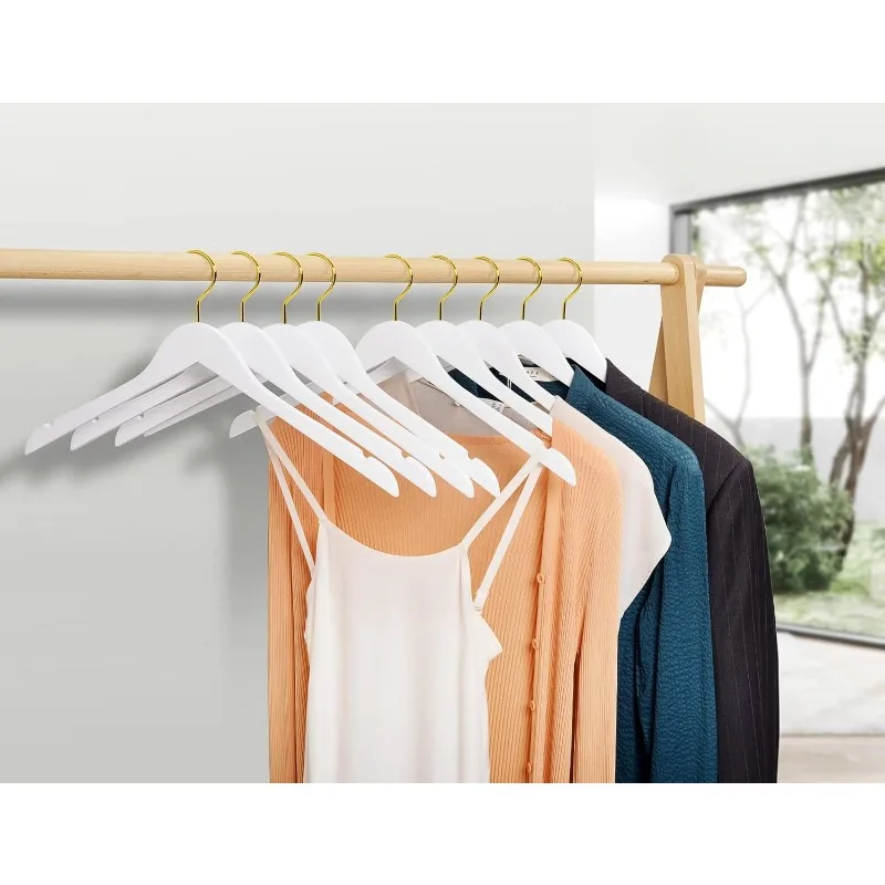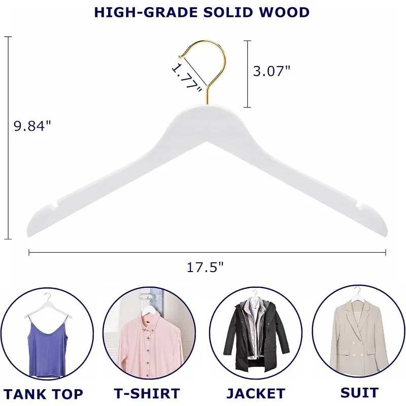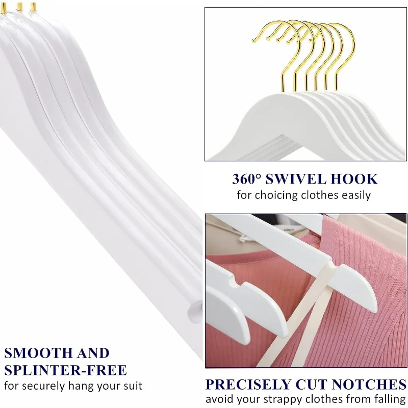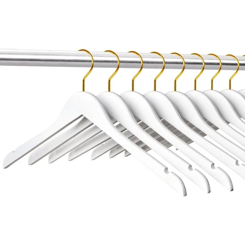 - 【PRACTICAL FEATURES】These luxurious clothes hangers are made of premium lotus wood with all practical features as a anti-rust 360° gold hook and a contoured shoulder line with perfectly cut notches. All of our wood hangers are sanded well and finished in white finish for stylish beauty.